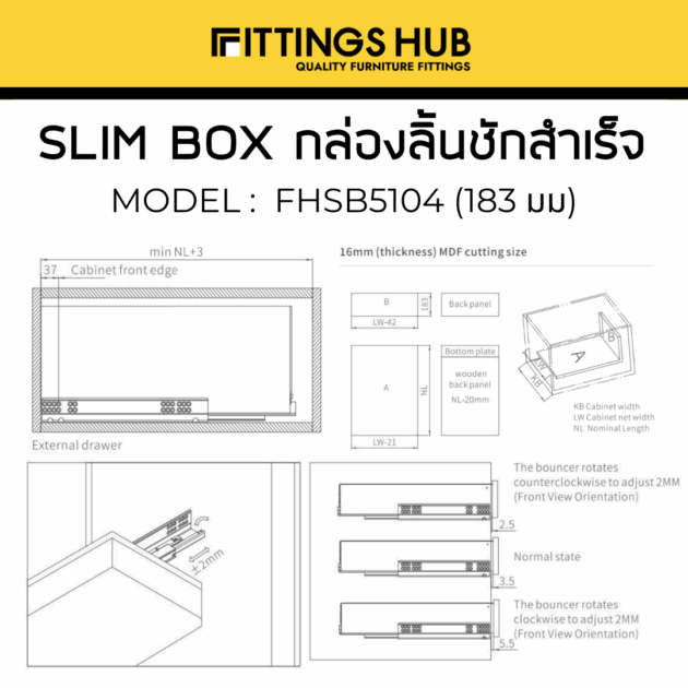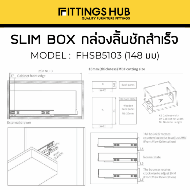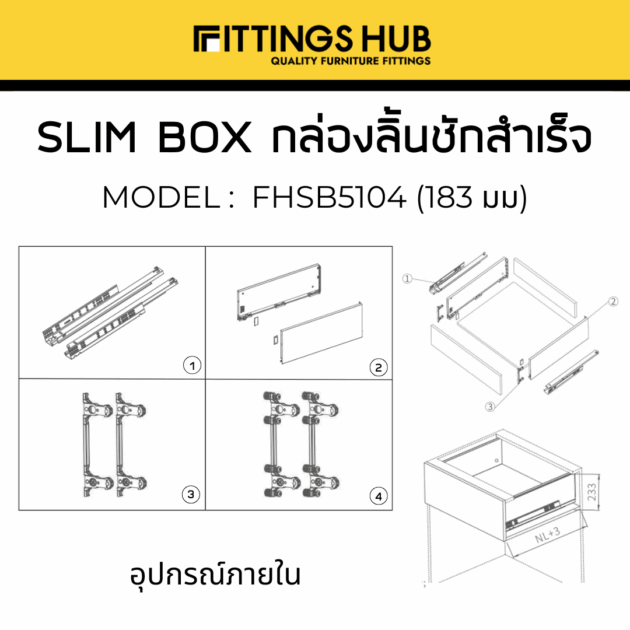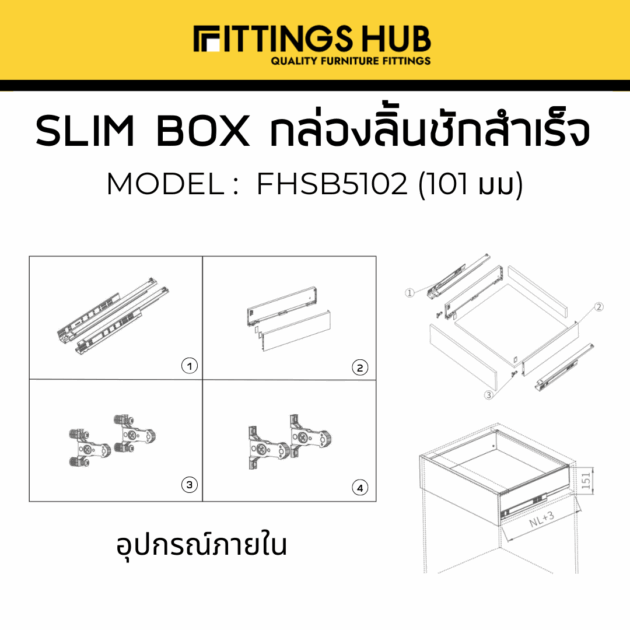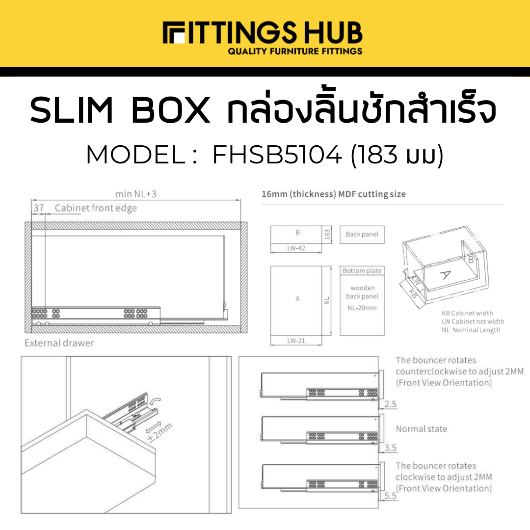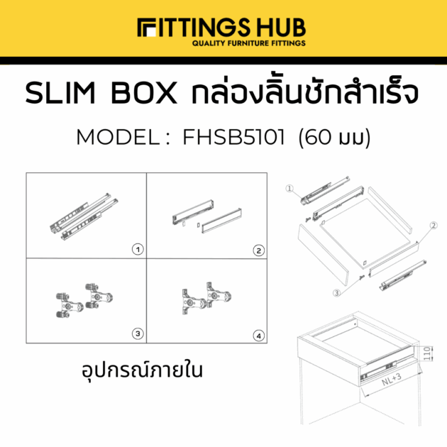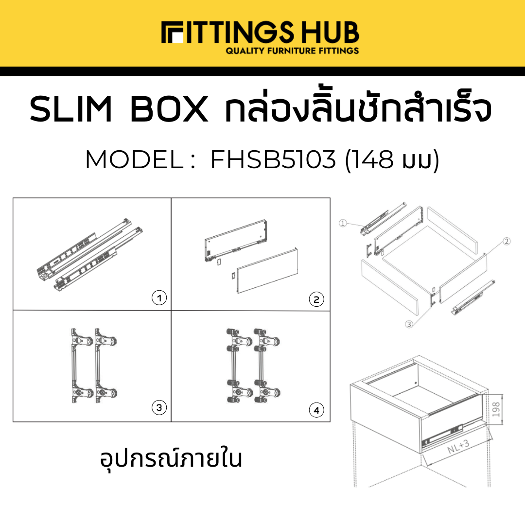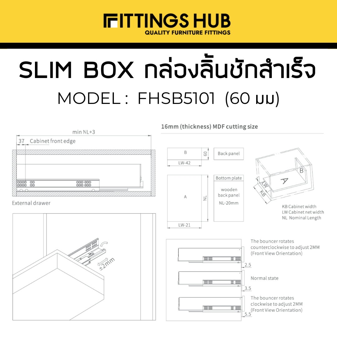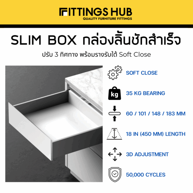 Slim box กล่องลิ้นชักสำเร็จ ปรับ 3 ทิศทาง พร้อมรางรับใต้ Soft Close – FITTINGSHUB